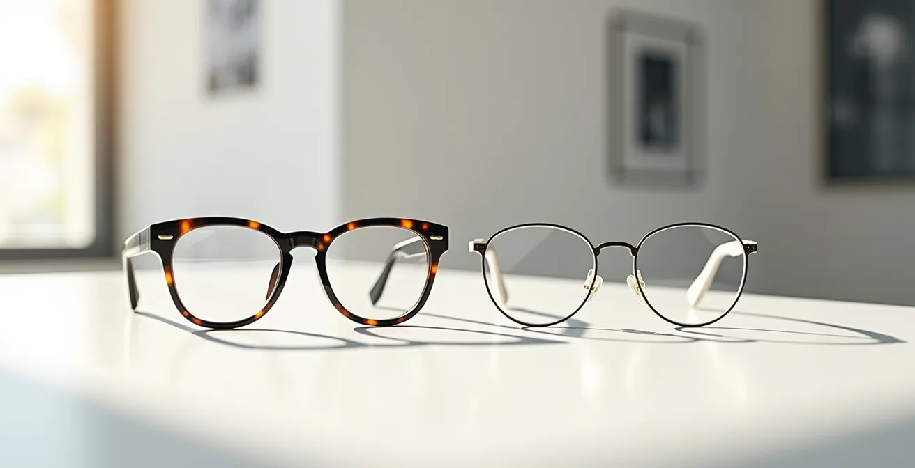 Une fois la règle de la petite taille acquise, le deuxième levier stratégique est la matière de la monture. Beaucoup de personnes complexées par l’épaisseur de leurs verres se tournent instinctivement vers des montures en métal, fines et discrètes, dans l’espoir que la monture « s’efface ». C’est une erreur fondamentale. Une monture fine ne fait que souligner par contraste l’épaisseur du verre qui dépasse. La véritable astuce est d’utiliser la monture non pas pour se cacher, mais pour camoufler activement.